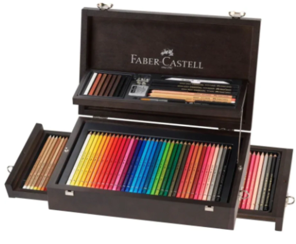Para el artista son una prestigiosa herramienta del oficio, para el conocedor son un objeto de diseño decorativo: los elegantes estuches teñidos en madera de wengué de Faber-Castell. Las herramientas sofisticadas del oficio son parte integrante del diseño creativo. Los lápices de artista y crayones pastel Polychromos, los lápices acuarelables Alberto Durero y la pequeña gama de lápices Pitt Monochrome se presentan en un estuche de dos niveles.
