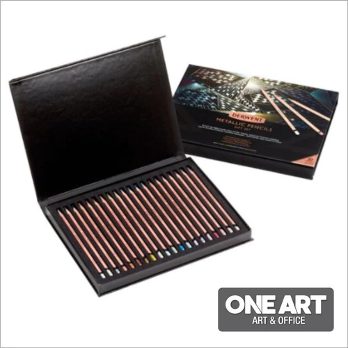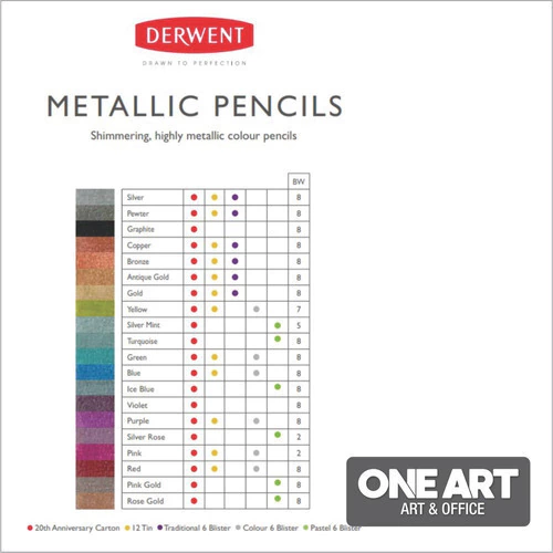 Celebrando dos décadas de diseño llamativo y generaciones de innovación Derwent, la nueva gama metálica ha sido rediseñada y ampliada, y se espera que artistas de todas las edades resalten la versatilidad y el brillo de la gama. No soluble pero altamente pigmentado para un efecto máximo, la gama de colores extendida incluye veinte colores que han sido fabricados por expertos por el equipo de investigación y desarrollo líder mundial de Derwent en Cumbria.