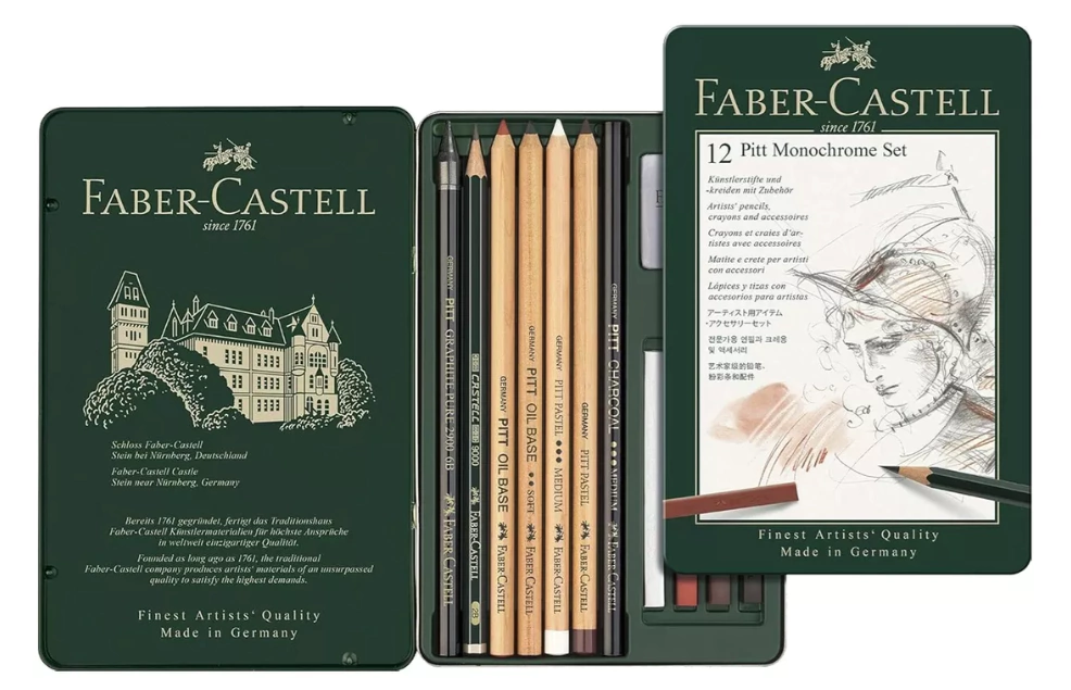 El juego incluye 1 lápiz de grafito Castell 9000 2B, 1 lápiz Pitt Graphite Pure 6B, 1 lápiz de carbón natural Pitt medio, 2 lápices de artista Pitt Oil Base (negro medio, sanguina), 2 lápices Pitt Pastel (marrón nogal, blanco suave) , 4 crayones Pitt Pastel y 1 borrador amasable